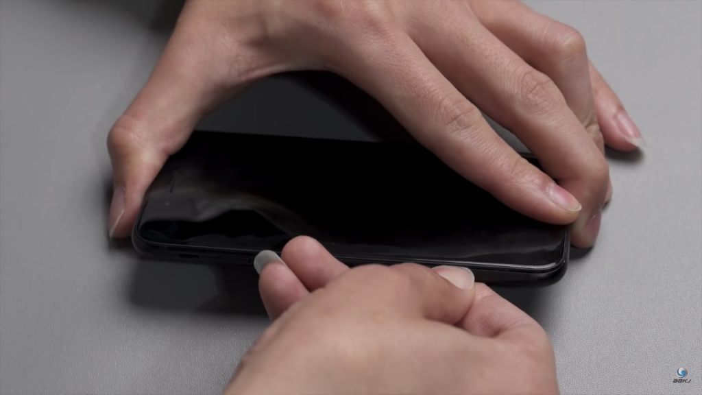 มาถึงขั้นตอนการชำแหละตัวเครื่องกันบ้าง แม้ว่า iPhone SE (2020) จะมากับมาตรฐานกันน้ำกันฝุ่น IP67 แต่เวลาแกะตัวเครื่องนั้นแทบจะไม่ต้องใช้ลมร้อนมาเป่าเพื่อให้กาวยึดเครื่องคลายตัวออกเหมือนสมาร์ทโฟนรุ่นอื่นๆ เพราะแค่เอาใบคัตเตอร์มางัดขึ้น จากนั้นเอาเล็บค่อยๆ สไลด์ไปเบาๆ เท่านี้ก็เรียบร้อยแล้ว (ตรงนี้อย่าลืมไขน็อต 2 อันบริเวณพอร์ตชาร์จออกก่อนนะ ไม่งั้นแกะเครื่องไม่ได้)