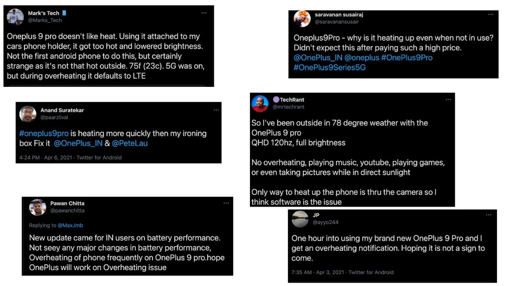 สำหรับปัญหาต่าง ๆ ที่เหล่าเจ้าของ OnePlus 9 Pro พบเจอกันคราวนี้ มาจากโพสท์ใน Twitter และใน Forum ของ OnePlus เอง ซึ่งปัญหาส่วนมากที่โดนบ่นกันก็คือปัญหาความร้อนจากการใช้งานทั่ว ๆ ไป อย่างเช่นผู้ใช้งานรายนึงถ่ายวิดีโอ 4K 60fps ได้แค่นาทีเดียวแอปกล้องก็ปิดลงเนื่องจากความร้อนสูง หรือยิ่งแย่กว่าคือผู้ใช้งานรายนึงไม่สามารถแม้แต่จะถ่ายรูปกลางแดดได้ เพราะเครื่องเกิดความร้อนสูงจนต้องปิดกล้องลงไป