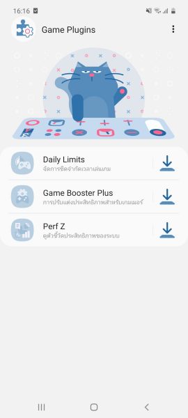 โดยการใช้งาน Game Plugins จะมีตัวเลือกในการปรับแต่งมาให้ทั้งหมด 3 ฟีเจอร์หลัก คือ Daily Limits (จำกัดเวลาการเล่นเกม), Game Booster Plus (ปรับแต่งประสิทธิภาพเครื่อง) และ Perf Z (ดูประสิทธิภาพเครื่อง) ซึ่งเราสามารถเลือกได้ว่าต้องการฟีเจอร์ไหนบ้าง จะได้ไม่ต้องโหลดมาทั้งหมดให้เปลืองพื้นที่ครับ