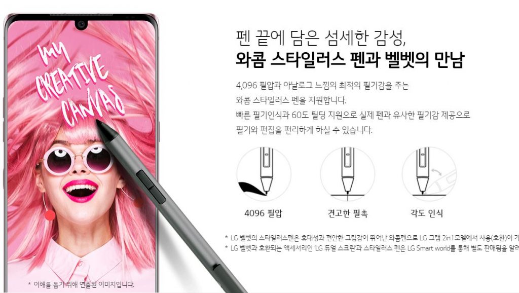 LG Velvet รองรับปากกา Wacom Stylus ที่รองรับแรงกดมากถึง 4,096 ระดับ สามารถหยิบขึ้นมาแล้วเขียนลงบนหน้าจอได้ทันที โดยทาง LG เคลมว่า ฟิลลิ่งการขีดเขียน จะให้ความรู้สึกใกล้เคียงกับการใช้ปากกาหรือดินสอเขียนลงบนกระดาษจริงๆ นอกจากนี้ยังรองรับอุปกรณ์จอเสริม LG Dual Screen อีกด้วย (แต่ต้องซื้อแยกทั้งคู่)