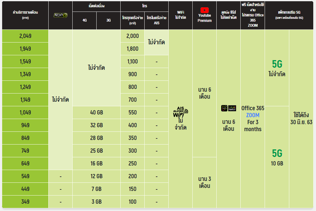 จากรูปตารางข้างต้นคือจะมีโปรตั้งแต่ราคา 349 – 2,049 บาท ซึ่งหากเราจะซื้อ Redmi Note 9 / Note 9 Pro จะต้องสมัครแพ็กเกจ 449 บาทขึ้นไปนะครับ โดยทุกโปรจะได้สิทธิ์ใช้งาน AIS Super WiFi ได้ไม่จำกัด, ดู AIS Play / Play Family ฟรีไม่เสียค่าเน็ตนาน 6 เดือน, ใช้เน็ตบนแอป Office 365 และ Zoom ฟรี นาน 3 เดือนอีกด้วย