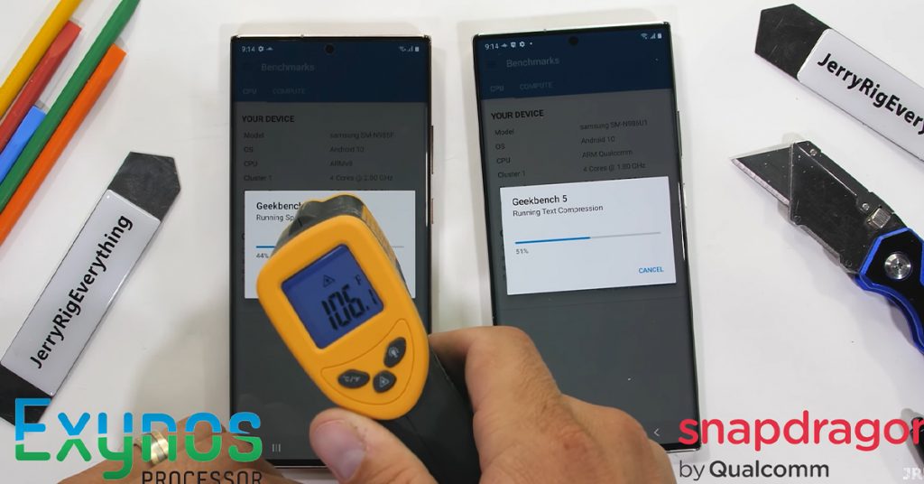 ซึ่งเมื่อปีก่อน JerryRigEverything เคยนำ Galaxy Note 20 Ultra รุ่นที่ใช้ Exynos 990 และ Snapdragon 865 มาเทียบกันแบบให้เห็นชัดๆ ผลปรากฎว่า Galaxy Note 20 Ultra ที่ใช้ชิปเซ็ตของ Qualcomm สามารถเค้นประสิทธิภาพออกมาได้ดีกว่ารุ่นที่ใช้ชิปของ Samsung เองแบบเห็นได้ชัดเลย ทว่าในรอบนี้ Samsung อาจจะกู้ชื่อเสียงเก่าคืนมากับ Exynos 2100
