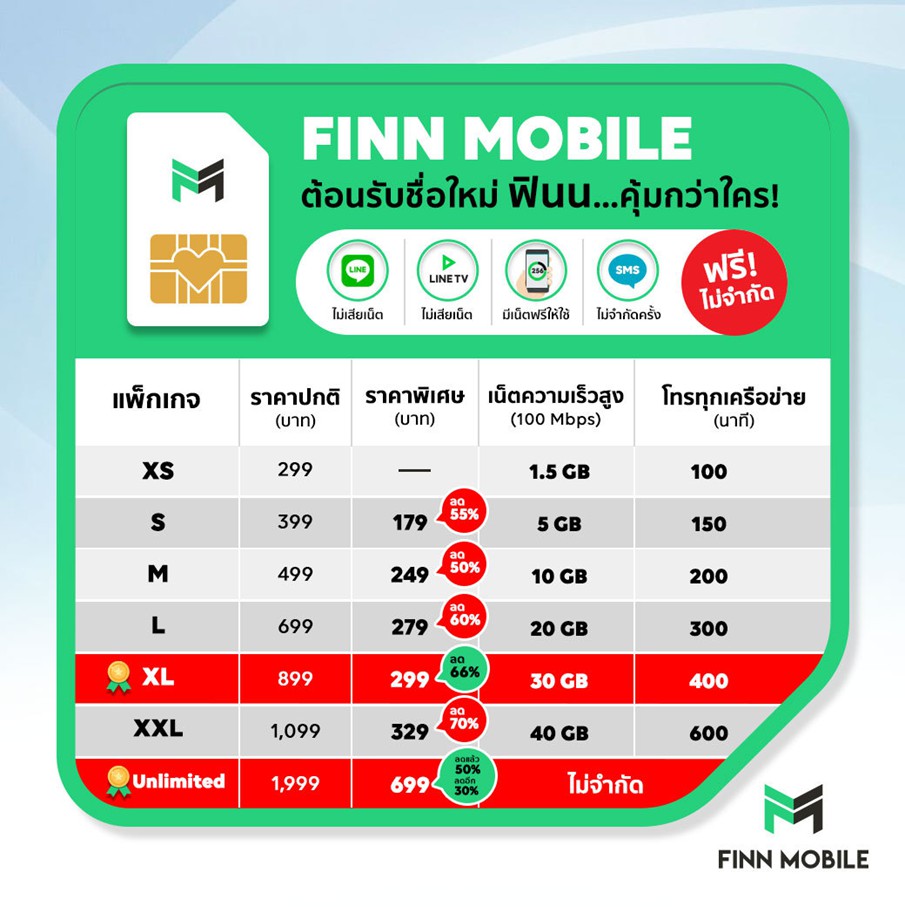 FINN MOBILE ชื่อใหม่ของ LINE MOBILE บริการซิมมือถือออนไลน์เต็มรูปแบบ แม้ว่าจะเป็นชื่อใหม่ แต่บริการทุกอย่างของ LINE MOBILE นั้น FINN MOBILE ยังมีให้เหมือนเดิมทุกประการ คุ้มกว่าใครด้วยซิมมือถือที่ถูกกว่าแน่นอน มีโปรแรงๆ ทั้งเน็ตและโทรด้วยส่วนลดสำหรับแพ็กเกจสูงสุดถึง 70% นาน 1 ปี โดยเริ่มต้นในแพ็กเกจ S เพียงเดือนละแค่ 179 บาท! ก็ได้เน็ตไปใช้ตั้ง 5GB แถมโทรฟรีทุกเครือข่ายอีก 150 นาที