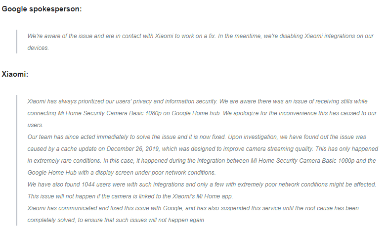 อัปเดตล่าสุดทาง Xiaomi ได้ออกมาขอโทษกับเหตุการณ์ที่เกิดขึ้นทั้งหมด ซึ่งปัญหาเกิดจาก cache update ในวันที่ 26 ธ.ค. 2019 โดยหากผู้ใช้งานกล้อง Mi Home Security Camera Basic 1080p เชื่อมต่อกับ Google Home Hub ด้วยสัญญาณอินเตอร์เน็ตที่ไม่ดีแล้วทำให้เกิดปัญหาการส่งภาพผิดพลาด และจากรายงานระบุว่ามีผู้ใช้งานอุปกรณ์สองอย่างนี้ร่วมกันอยู่ 1,044 ราย แต่มีเพียงส่วนน้อยเท่านั้นที่พบ