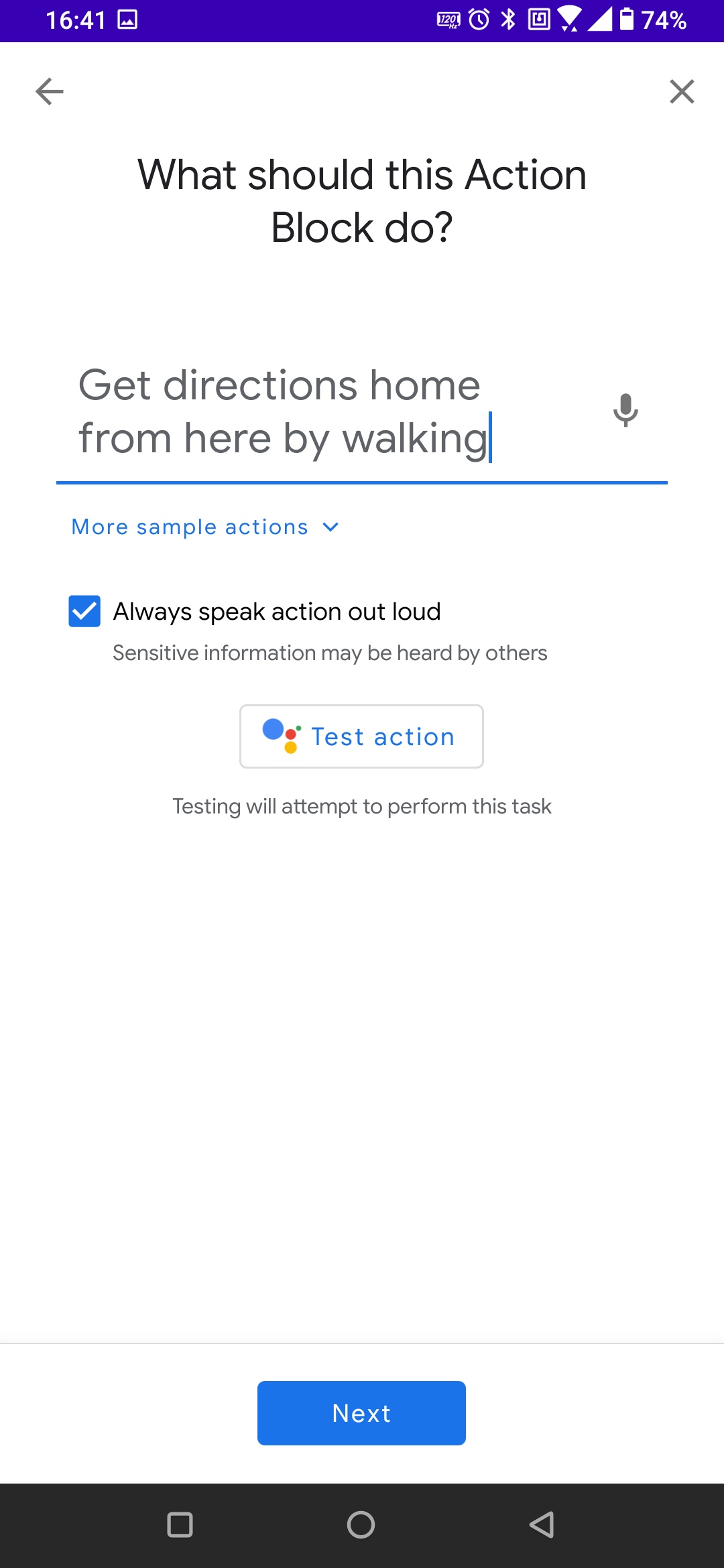นอกจากนี้เรายังใส่คำสั่งเป็นภาษาไทยก็ได้ อย่างเช่น “นำทางกลับบ้าน” หรือ “นำทางไปโรงพยาบาล *ชื่อโรงพยาบาล*” จากนั้นลองกดที่ปุ่ม Test action ดูก่อน ว่ามือถือทำตามคำสั่งเราถูกต้องรึเปล่า (ถ้าไม่ถูกต้องให้ลองเปลี่ยนคำสั่งใหม่) และกดที่ Next เพื่อไปสู่การสร้างปุ่ม