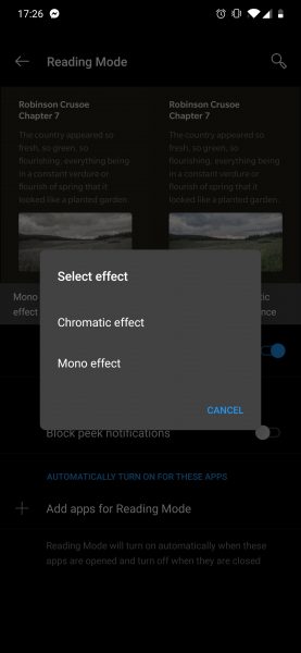 ฟีเจอร์สามัญประจำเครื่องโทรศัพท์อย่างฟีเจอร์ตัดแสงสีฟ้าซึ่งทาง OnePlus ตั้งชื่อว่า Night Mode ก็มีมากับเขาเหมือนกัน สามารถตั้งเวลาเปิดปิดได้ด้วยนะ สำหรับใครที่ชอบเล่นมือถือในที่แสงน้อยๆ แนะนำเลยว่าเปิดเถอะ เพราะมันสบายตาและช่วยถนอมสายตากว่าโหมดปกติมากๆ แต่ถ้ายังไม่พอ ยังมี Reading Mode มาให้เลือกอีก ลดแสงสีฟ้าลง สบายตาขึ้นแต่จะอมเหลืองนิดๆ และมีให้เลือก 2 แบบคือ Chromatic Effect (สีจางๆ) และ Mono Effect (สีขาวดำ)