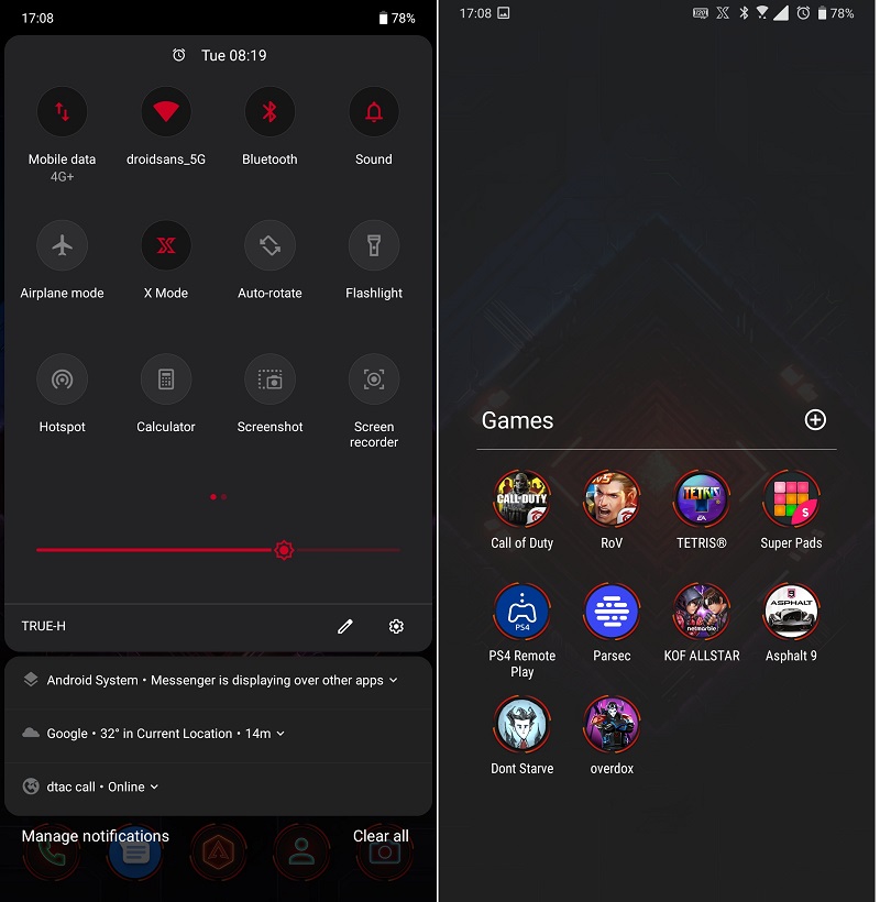 เมื่อเราเปิดฟีเจอร์นี้ปุ๊บไฟ RGB ด้านหลังเครื่องก็จะติดขึ้นมาทันที พร้อมกับหน้าตาของ UI ก็จะเปลี่ยนไปนิดหน่อย เพราะขอบของไอคอนแอปต่างๆ จะมีวงกลมสีแดงขึ้นมาให้เห็น ประมาณว่าตอนนี้เครื่องแรงสุดๆ พร้อมเล่นเกมได้หมดแล้ว ซึ่งโหมดนี้จะเป็นการหน่วยความจำทั้งหมดเพื่อมาลงที่เกมอย่างเดียว