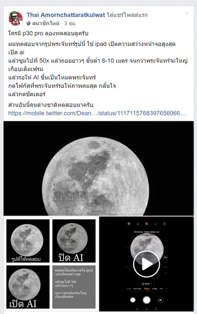 โดยวิธีการของเขาคือการนำเอา iPad มาเปิดภาพพระจันทร์ ซึ่งได้ทำการเติมตัวอักษร aaa เพิ่มเข้าไป หลังจากนั้นก็ทดลองถ่ายภาพซูมหน้าจอ iPad ด้วยการเปิดกล้อง P30 Pro แล้วถอยไปไกลๆ ประมาณ 8-10 เมตร เพื่อให้ได้ระยะซูม 50 เท่า จนพระจันทร์ aaa เต็มเฟรม หลังจากนั้นก็ทดลองถ่ายด้วยการเปิด AI และปิด AI เทียบกัน ซึ่งผลที่ออกมาคือตัวอักษร aaa เลือนลางหายไปในภาพที่เปิด AI ส่วนภาพที่ไม่ได้เปิด AI นั้นยังมีตัว aaa ให้เห็นบนผิวดวงจันทร์