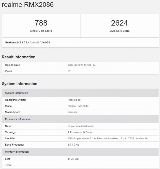 และก่อนหน้านี้ก็มีผลคะแนน Geekbench ของมือถือรหัสโมเดล RMX2086 ที่คาดว่าคือ realme X3 SuperZoom หลุดออกมา โดยข้อมูลดังกล่าวเปิดเผยว่ามือถือรุ่นนี้จะใช้ชิปเซ็ต Snapdragon 855+ ซึ่งสามารถทำคะแนนแบบ Single Core ไปได้ 788 คะแนน และแบบ Multi-Core ที่ 2,624 คะแนน นอกจากนี้ยังมากับ RAM ขนาด 12GB อีกด้วย